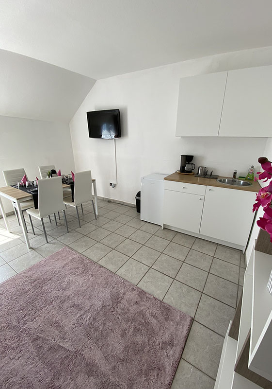 Ausstattung: Spüle, Kühlschrank, elektrische Herdplatten, Töpfe, Pfannen, Wasserkocher, Teller, Besteck, Gläser, Tassen, Essbereich, Ventilator.